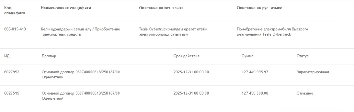 Мемлекеттік сатып алулар порталындағы мәліметке сүйенсек, көлік 127,4 миллион теңгеге сатып алынған. Төлем 2025 жылдың қараша және желтоқсан айларында екі траншпен жүргізілген.