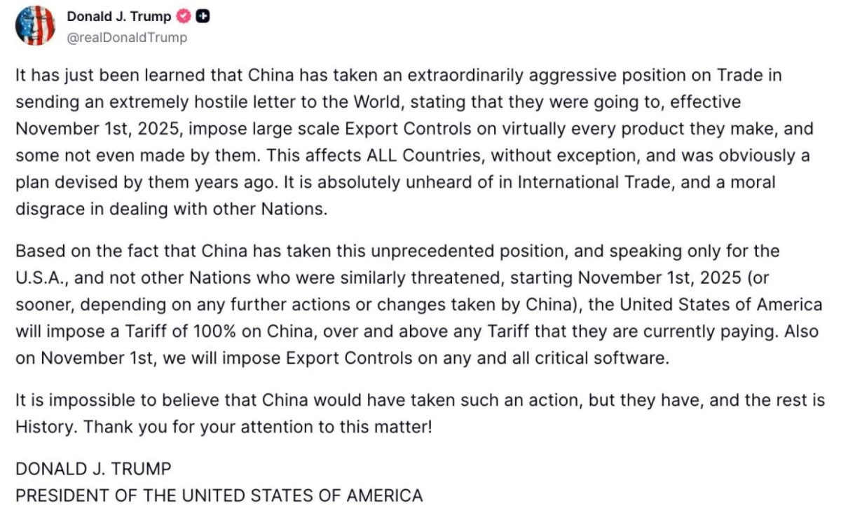 АҚШ 1 қарашадан бастап Қытайдан келетін тауарларға “қазір төленіп отырған кез келген баж салығының үстінен” тағы 100%-дық экспорттық тариф енгізеді. Сондай-ақ стратегиялық маңызы бар ақпараттық технологияларға экспорттық бақылау қойылады.