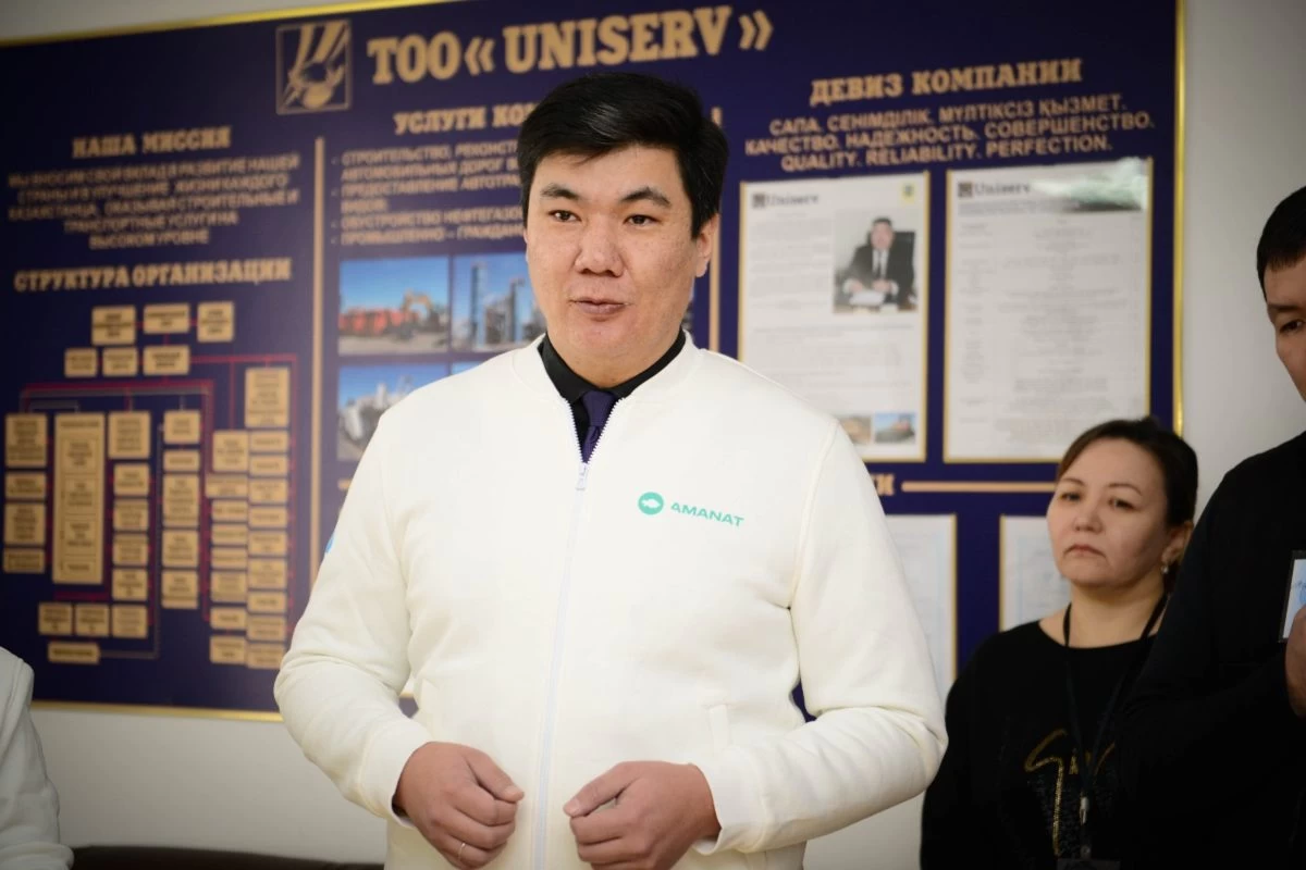 Кандидат Дінмұхамед Сәтбаев "Uniserv" компаниясына еншілес "Uniserv Транс" кәсіпорнын басқарады. Компанияда 330-дан астам адам еңбек етеді. Оның 120-сы вахталық әдіспен жұмыс істеп жүр. Компания жол құрылысы саласында беделді ұйымға айналды. Мемлекеттік бағдарламалар шеңберінде жүргізілген құрылыс жұмыстарын сапалы атқара білді. Дінмұхамед Сәтбаев еңбек ұжымын саяси науқанда да белсенділік танытуға және "AMANAT" партиясына дауыс беруге шақырды.