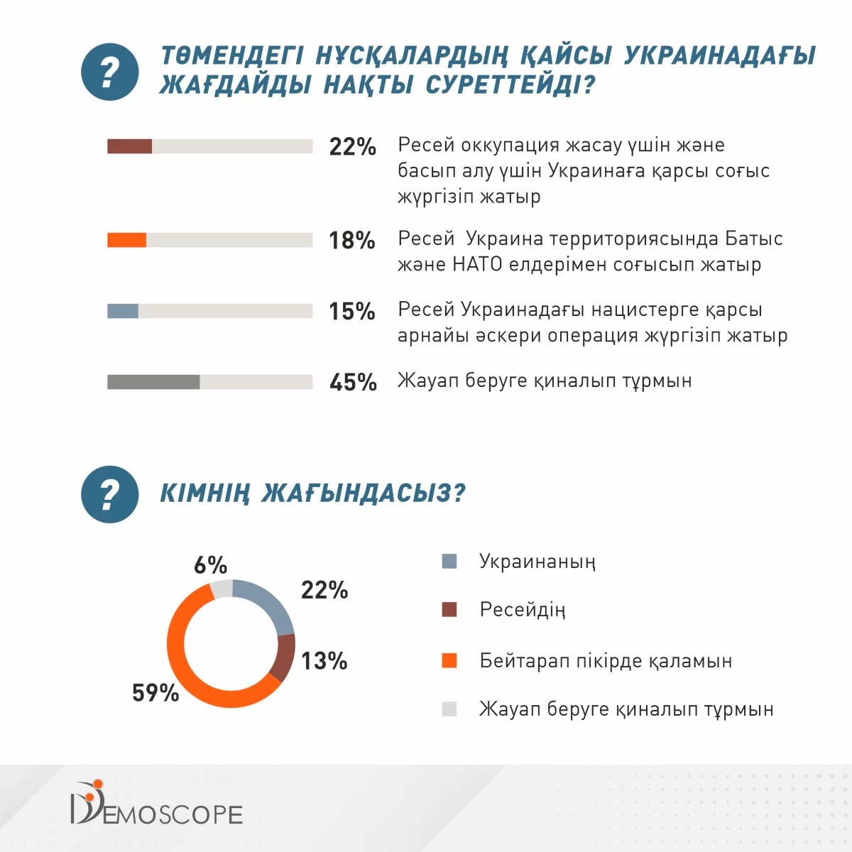 Респондерттердің 22%-ы Украинаға, 13%-ы Ресейге жақтас болып шықты. Ал басым бөлігі ешбір тарапты қолдамай отыр. Олардың үлесі – 59 %.