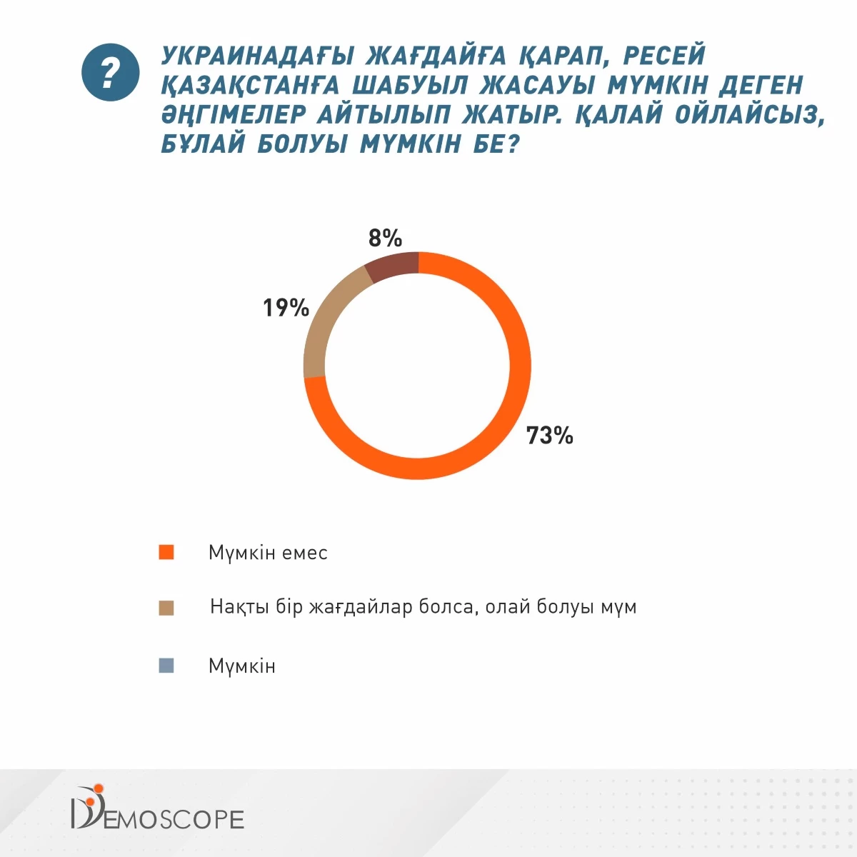 Ресей Украина аумағына басып-кіргенде қоғамда Мәскеу Қазақстанға да шабуы мүмкін бе деген сұрақ туған еді. DEMOSCOPE-қа сенсек, сауалнамаға қатысқандардың 73%-ы Ресейге Қазақстанға басып-кірмейді деп ойлады.