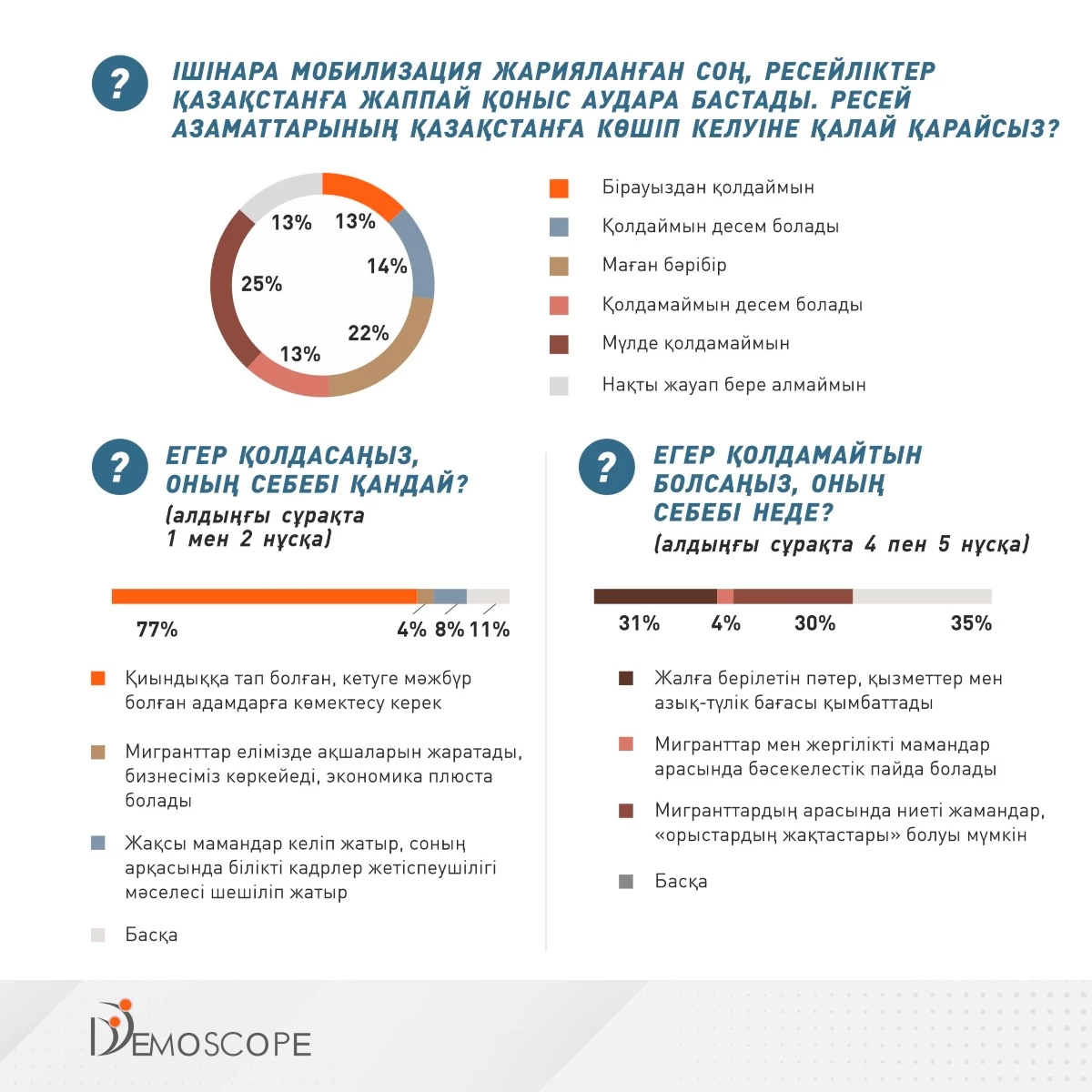 Жауап бергендер мобилизация жарияланғаннан кейін Ресейден Қазақстанға келіп жатқанына қалай қарайтынын да айтты. Олардың 25%-ы орыс азаматтарының жаппай қоныс аудара бастағанына мүлдем қарсы, ал 22%-ы “маған бәрібір” деп жауап берген. Қолдағандар үлесі – 13%.