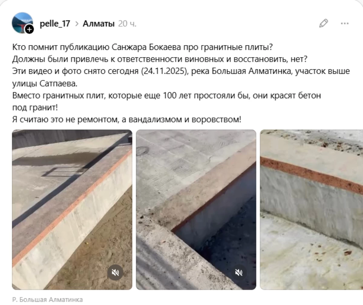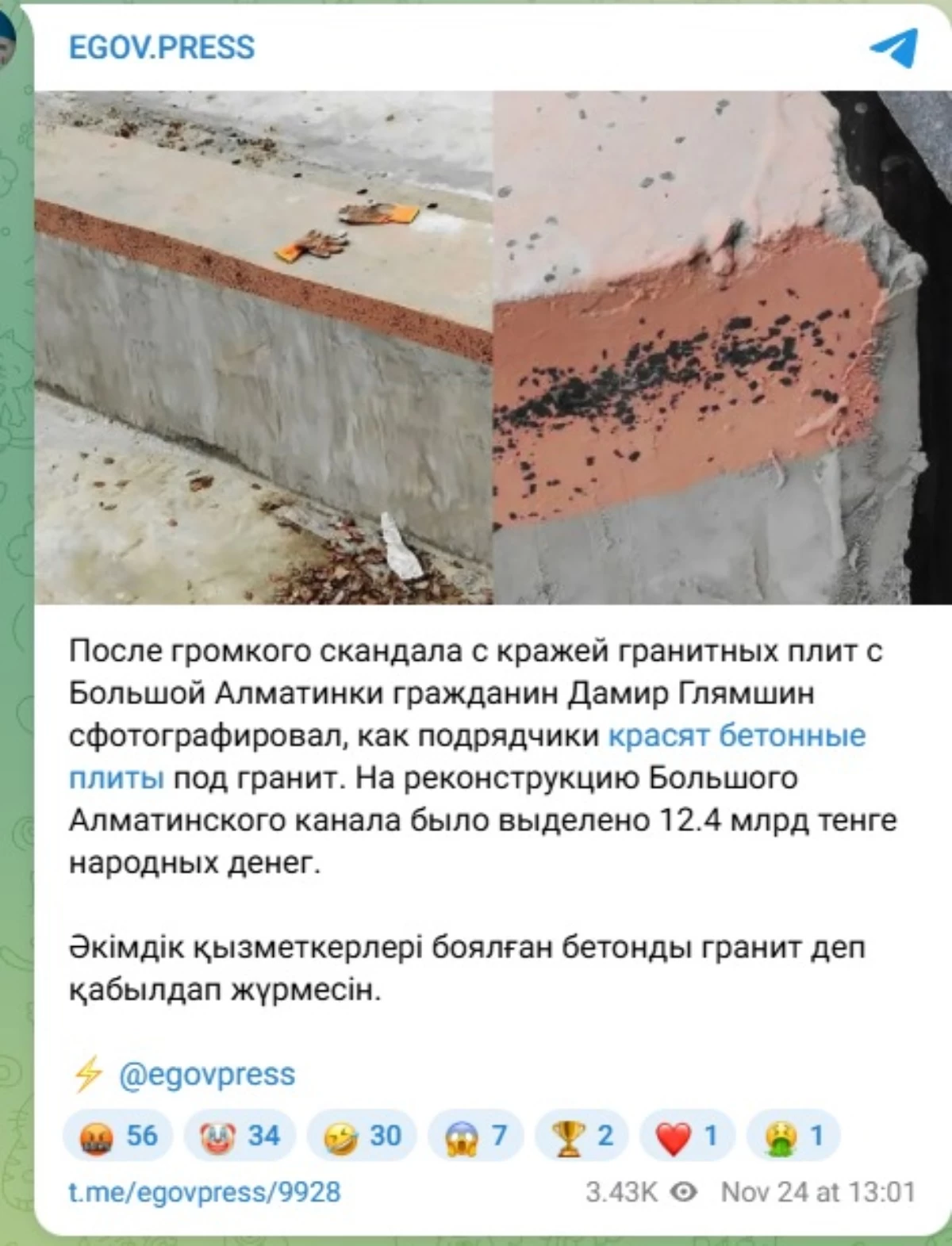 "Үлкен Алматы каналынан гранит плиталарын ұрлауға қатысты атышулы жанжалдан кейін тұрғын Дамир Глямшин мердігерлердің бетон плиталарын гранитке ұқсату үшін бояп жатқанын суретке түсірген. Каналды қайта құруға мемлекеттен 12,4 миллиард теңге бөлінген", – делінген жазбада.