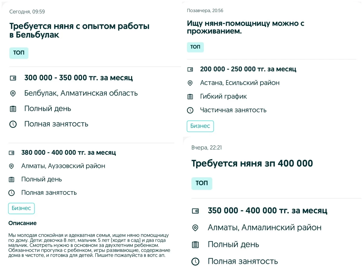 Әлеуметтік желіден де бала күтушісі қызметіне қанша теңге алатынын салыстырып көрдік. Мысалы, кейбірі Алматы облысында 300-350 мың теңге, Астанада 200-250 мың теңге, Алматыдағы Әуезов ауданы үшін 380-400 мың теңге алатынын айтады. Бірақ осы бағаға 2 жасар және 5 пен 8 жастағы балаларды да қарау керек екенін жазып қойған. Мұнда ол күтуші болып қана қоймай, тағы да үй жинап, тамақ та жасау керек екені көрсетілген.