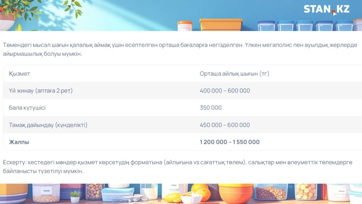 Егер үй шаруасы мен бала күтімін кәсіби қызметтер арқылы орындау керек болса, оның ай сайынғы құны айтарлықтай жоғары болуы мүмкін. Қазақстандағы қызметтердің орташа бағасына сүйеніп есептеп көрдік.