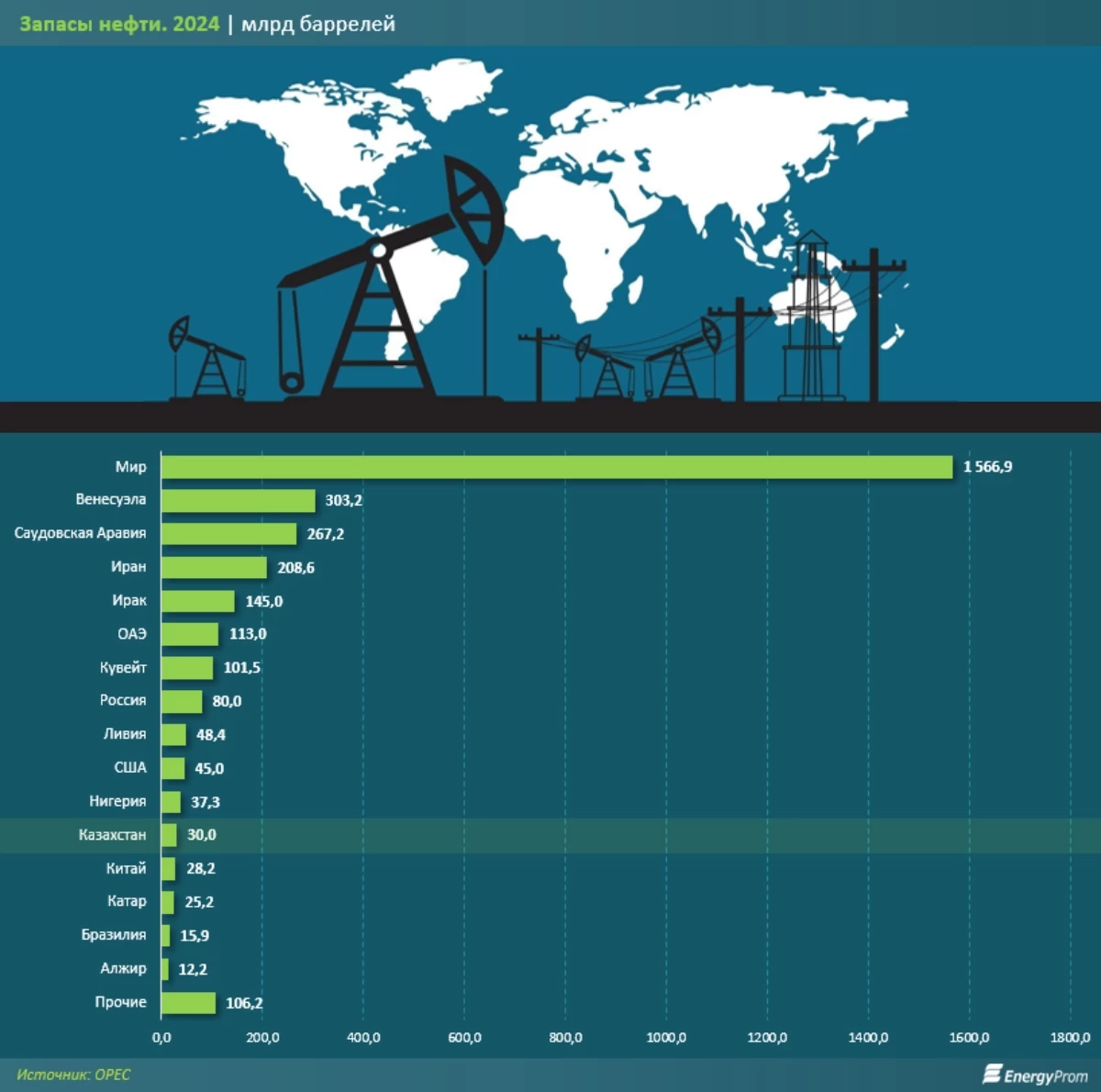 Әлемдік мұнай қорлары негізінен саяси және геосаяси тәуекелі жоғары елдерде шоғырланған. Бұл мұнай нарығындағы белгісіздікті күшейтіп, бағаға тікелей әсер етеді. Шамамен 30 миллиард баррель ресурстық базасы бар Қазақстан орташа позицияны иеленеді.