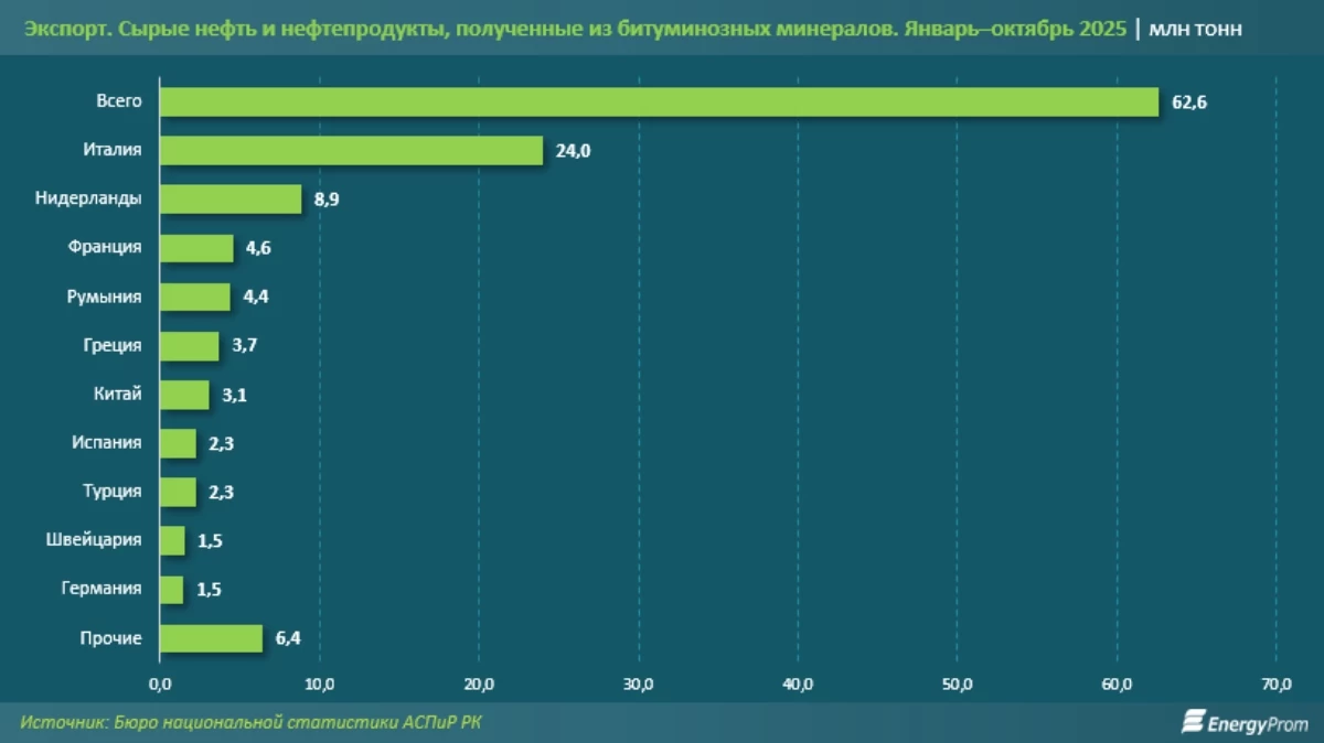Италия мен Нидерланды Қазақстанның негізгі экспорттық бағыттары болып қалды. Сәйкесінше 24 миллион және 8,9 миллион тонна, бұл жалпы көлемнің жартысынан көбін қамтыды. Францияға (4,6 миллион тонна), Румынияға (4,4 миллион тонна) және Грецияға (3,7 миллион тонна) айтарлықтай көлемдер экспортталды. Қытайға 3,1 миллион тонна мұнай экспортталды.
