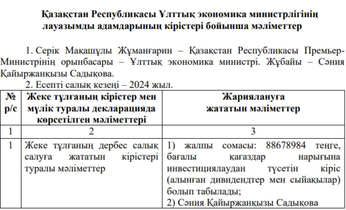 Премьер-министрдің орынбасары – ұлттық экономика министрі Серік Жұманғарин 2024 жылғы табысы туралы мәліметтерді жариялады. Бұл туралы Stan.kz ақпарат агенттігі хабарлайды.