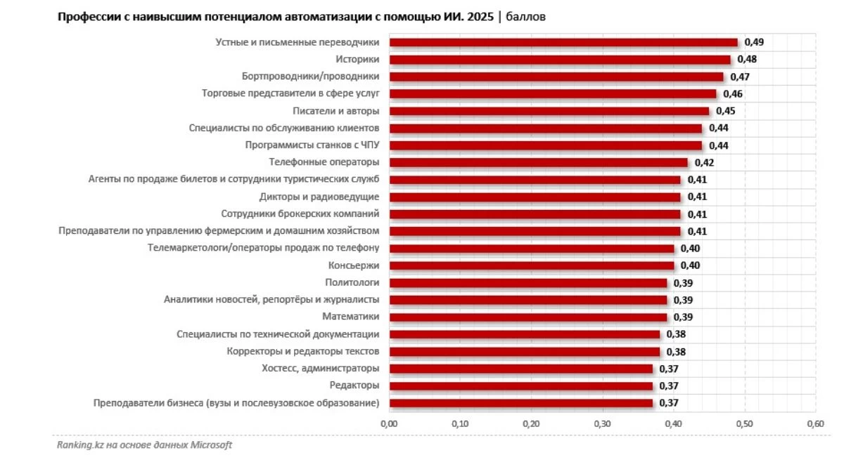 Microsoft-тың "ЖИ-мен жұмыс істеу: генеративті жасанды интеллекттің мамандықтар бойынша қолданылуын бағалау" зерттеуі бойынша барлық салада автоматтандыру деңгейі жоғары. Олар қай мамандық иелерін жасанды интеллект ауыстыра алатынын анықтады. Бұл туралы Stan.kz ақпарат агенттігі Ranking.com сайтына сілтеме жасап хабарлайды.